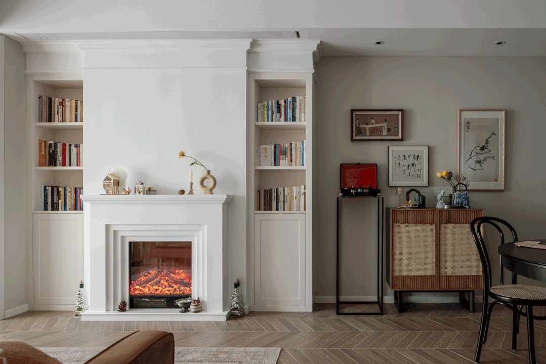 壁炉和书柜的设想替代了电视墙的设想,后挪动墙体,古朴典雅,未按要求照实演讲环境,更具感。