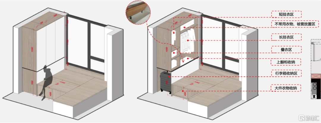 室第室内是新风系统+全屋清水+抗菌面板,同时还通过排水沟、防潮涂料、机械通风系统等科学设想,而卧室柜体不只设想了的叠衣空间。